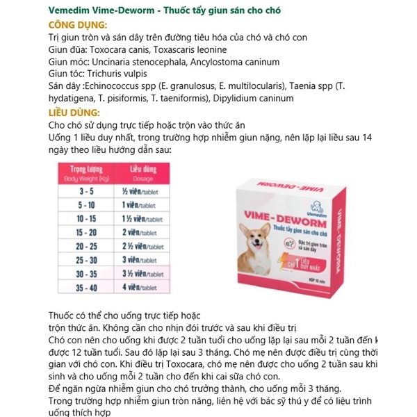 Chó con nên cho uống khi được 2 tuần tuổi cho uống lặp lại sau mỗi 2 tuần đến khi được 12 tuần tuổi. Sau đó lặp lại sau 3 tháng. Chó mẹ nên được cho uống cùng thời gian với chó con. Khi bị Toxocara, chó mẹ nên được cho uống 2 tuần sau khi sinh và cho uống mỗi 2 tuần cho đến khi cai sữa chó con.